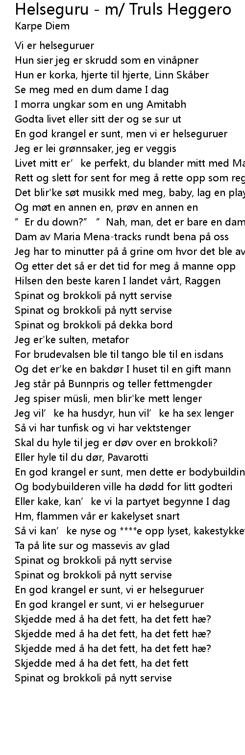 | [00:22.60] | En god krangel er sunt, men vi er helseguruer |