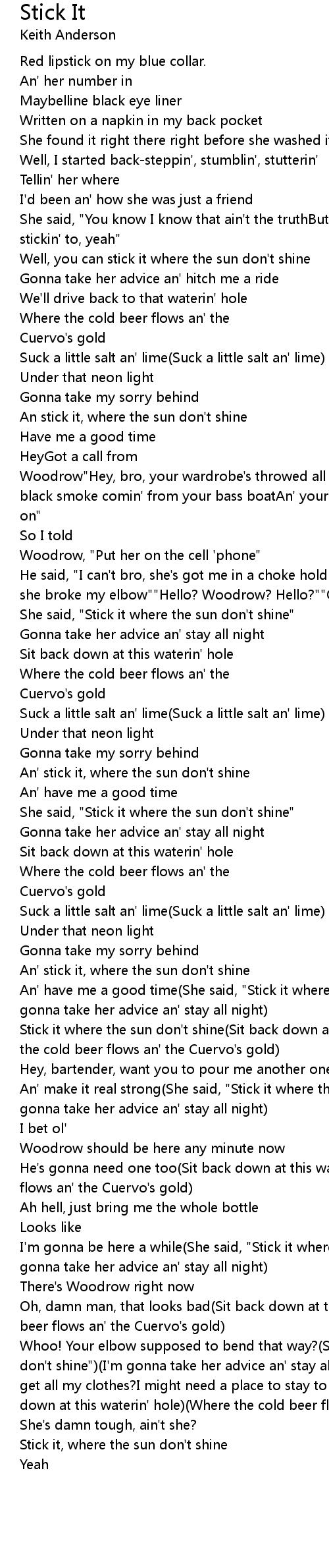 Whoo! Your elbow supposed to bend that way?(She said, "Stick it where the sun don't shine")(I'm gonna take her advice an' stay all night)"Hey brother, did you get all my clothes?I might need a place to stay to stay for a while"(Sit back down at this waterin' hole)(Where the cold beer flows an' the Cuervo's gold) |