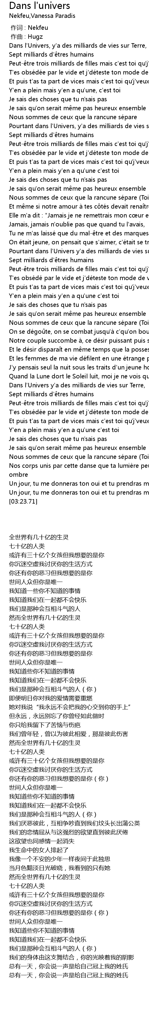 | [02:37.41] | Dans l'Univers y'a des milliards de vies sur Terre, |