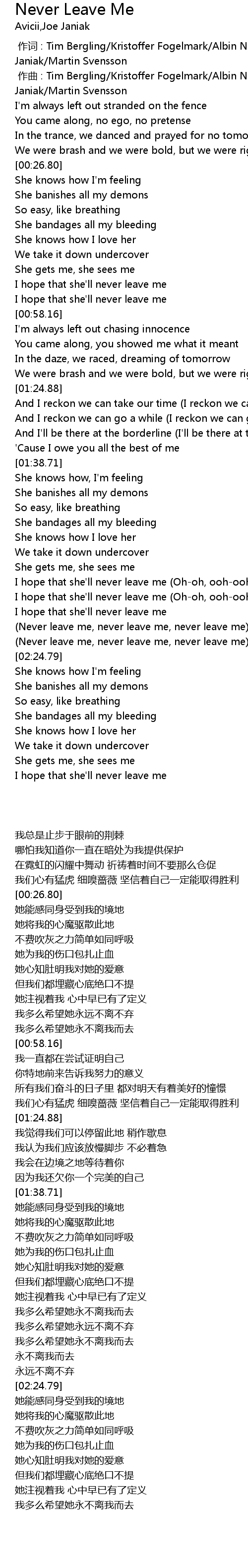 | [02:13.15] | Never leave me, never leave me, never leave me |