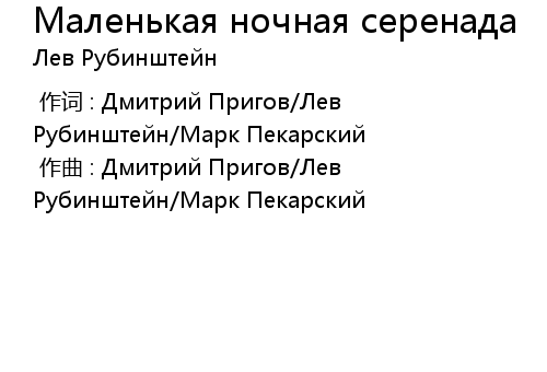 | [00:00.000] | 作词 : Дмитрий Пригов/Лев Рубинштейн/Марк Пекарский |