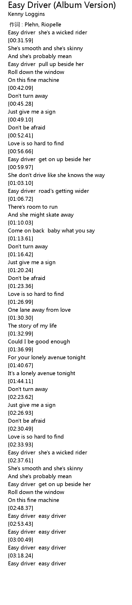| [00:28.91] | Easy driver she' s a wicked rider |