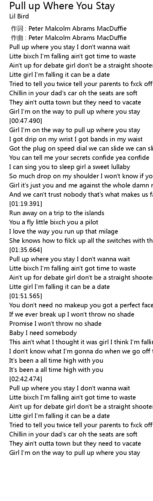 | [02:43.742] | Pull up where you stay I don' t wanna wait |