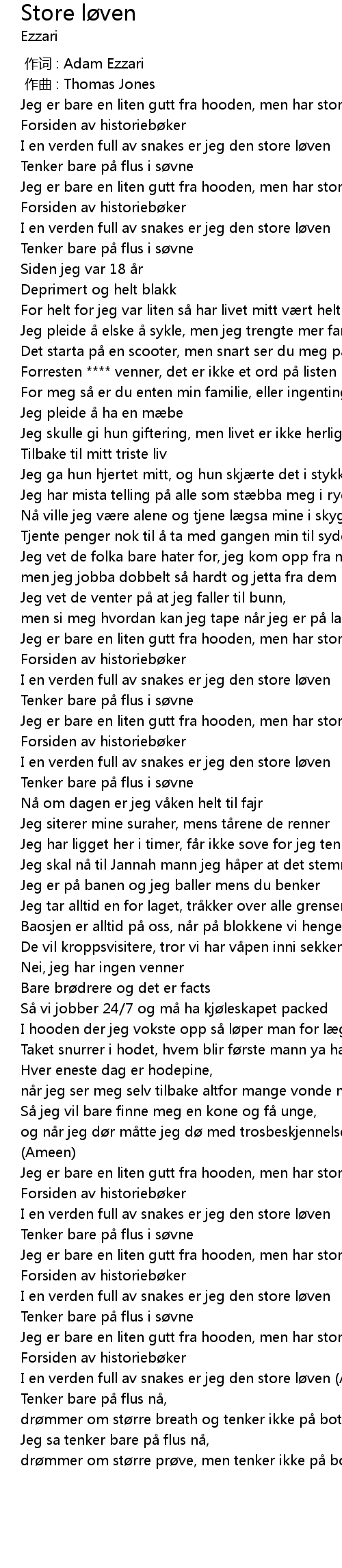| [03:00.74] | Jeg er bare en liten gutt fra hooden, men har store dr mmer |