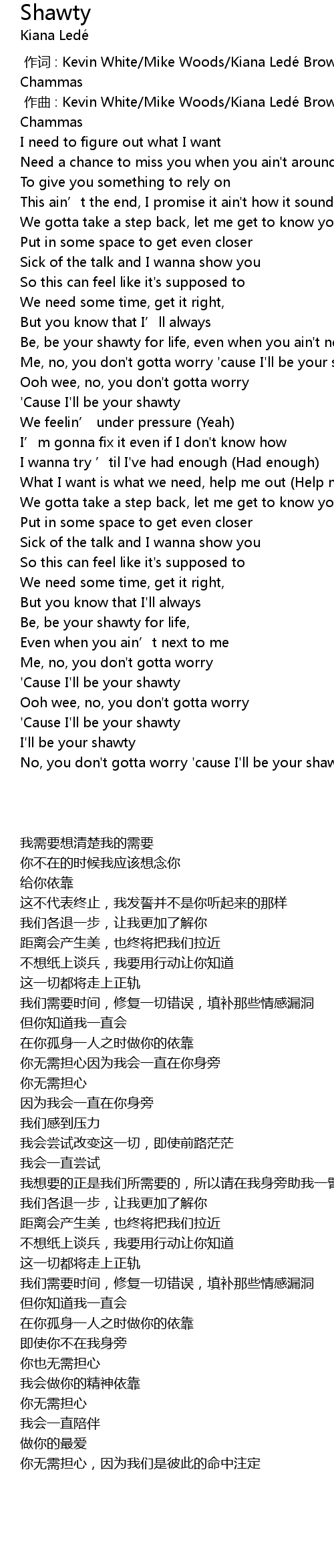 | [00:38.90] | Me, no, you don't gotta worry 'cause I'll be your shawty |