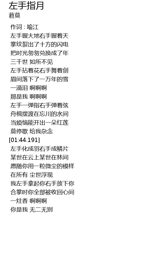 | [01:57.692] | zuǒ shǒu huà chéng yǔ yòu shǒu chéng lín piàn |