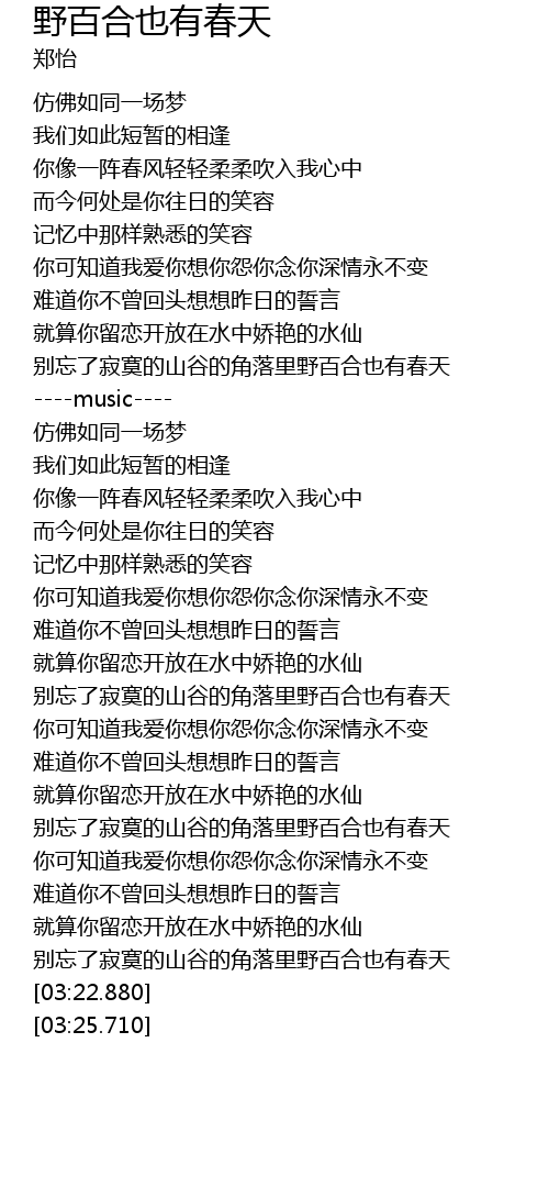 | [03:15.640] | 别忘了寂寞的山谷的角落里野百合也有春天 |
