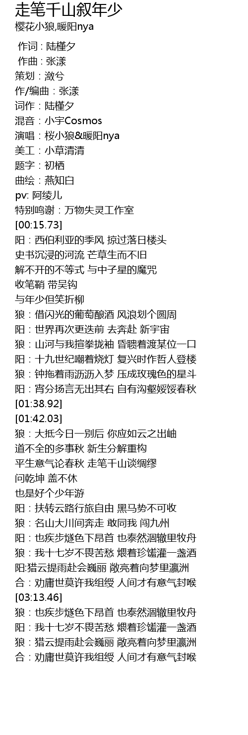 | [03:13.87] | 狼:也疾步燧色下昂首 也泰然涸辙里牧舟 |