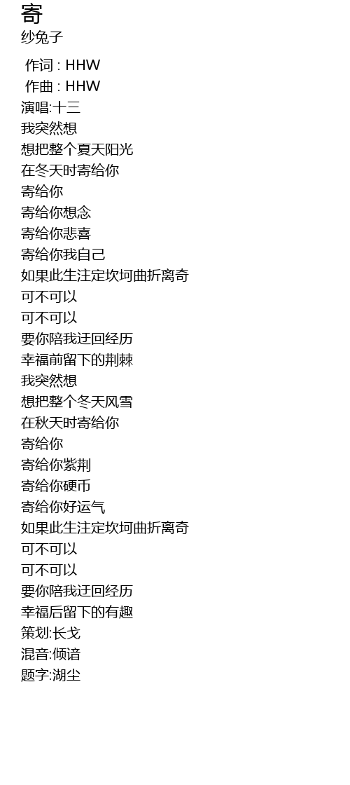 | [01:31.173] | jì gěi nǐ zǐ jīng |