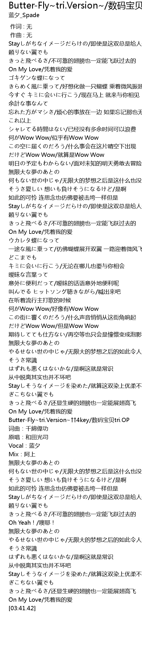 | [02:25.40] | ButterFly tri. Version 4key shù mǎ bǎo bèi tri. OP |