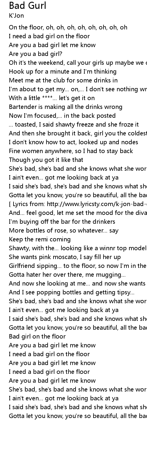 | [ Lyrics from: http://www.lyricsty.com/k-jon-bad-gurl-lyrics.html ] | |