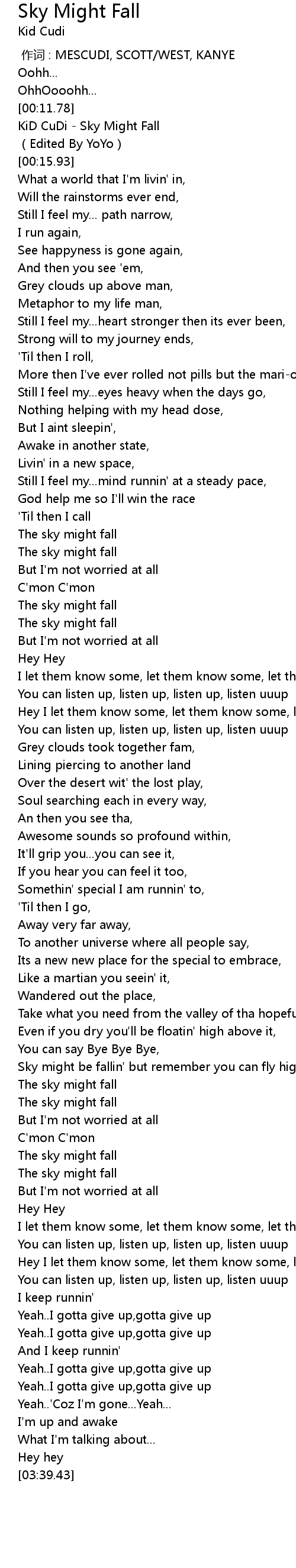 | [00:12.78] | KiD CuDi Sky Might Fall |