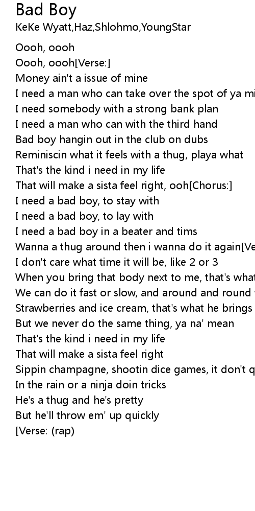 I need a bad boy[Chorus: 2x][Verse: (rap)][Chorus: until fade off] |