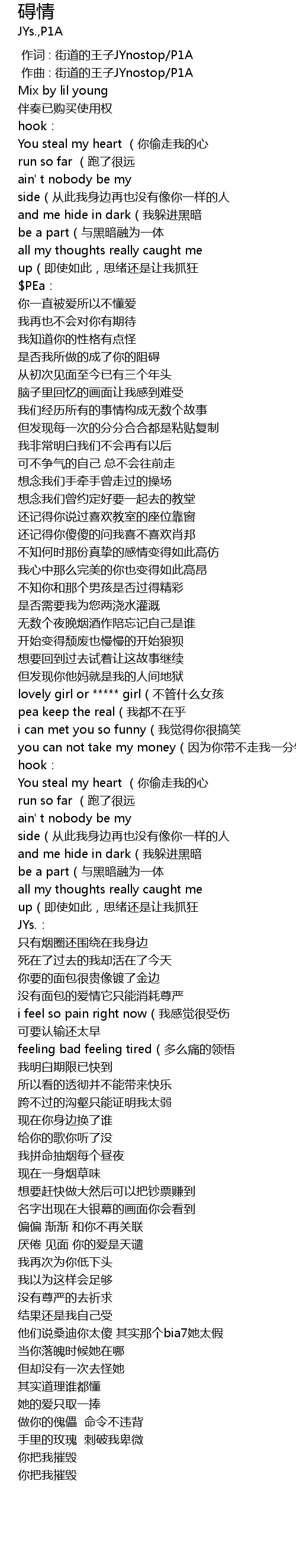 | [00:00.000] | 作词 : 街道的王子JYnostop/P1A |