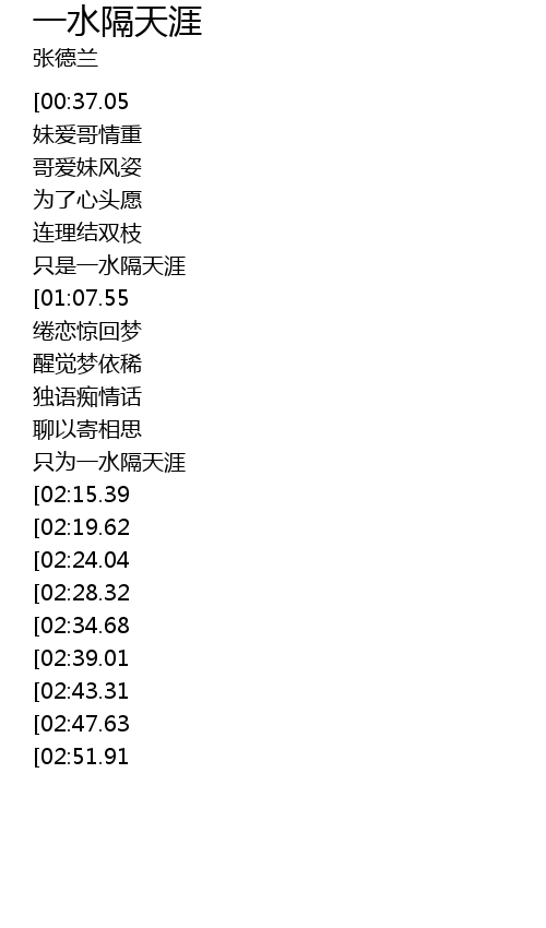 | [00:06.99][00:37.05][01:57.59][03:16.07] | zhāng dé lán yī shuǐ gé tiān yá yuè |