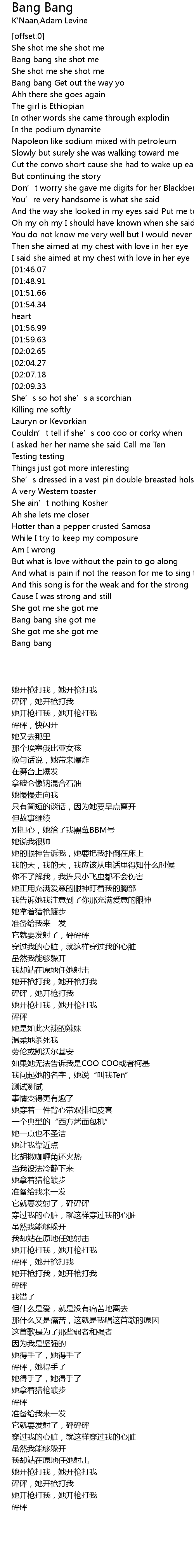| [02:51.85][02:04.27][01:05.57] | Bang bang she shot me |