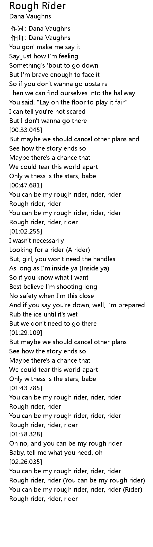 | [02:30.316] | Rough rider, rider (You can be my rough rider) |