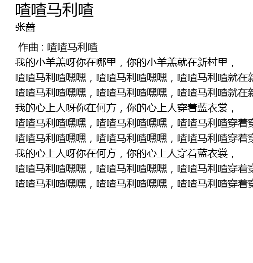 | [00:43.000] | 喳喳马利喳嘿嘿,喳喳马利喳嘿嘿,喳喳马利喳就在新村里。 |