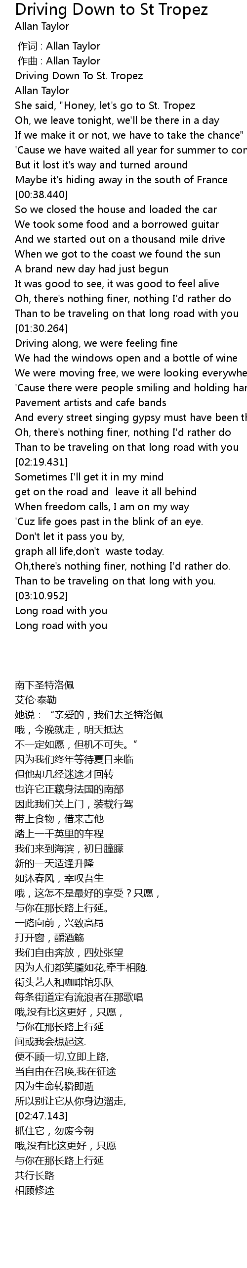 | [00:12.055] | She said, " Honey, let' s go to St. Tropez |