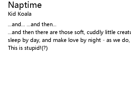 | ...and then there are those soft, cuddly little creatures, the koala bears. They sleep by day, and make love by night - as we do, mostly. | |