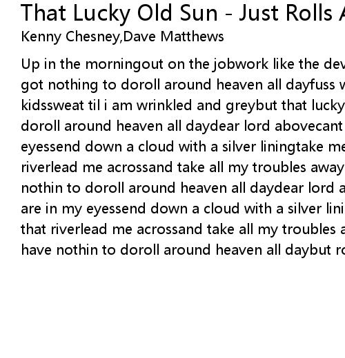 Up in the morningout on the jobwork like the devil for my paylucky old usnaint got nothing to doroll around heaven all dayfuss with my womantoil for my kidssweat til i am wrinkled and greybut that lucky old sunaint got nothin to doroll around heaven all daydear lord abovecant you see im cryintears are in my eyessend down a cloud with a silver liningtake me to paradiseshow me that riverlead me acrossand take all my troubles awaylike the lucky old sunill have nothin to doroll around heaven all daydear lord abovecant you see im cryintears are in my eyessend down a cloud with a silver liningtake me to paradiseshow me that riverlead me acrossand take all my troubles awaylike the lucky old sunill have nothin to doroll around heaven all daybut roll around heaven all day....