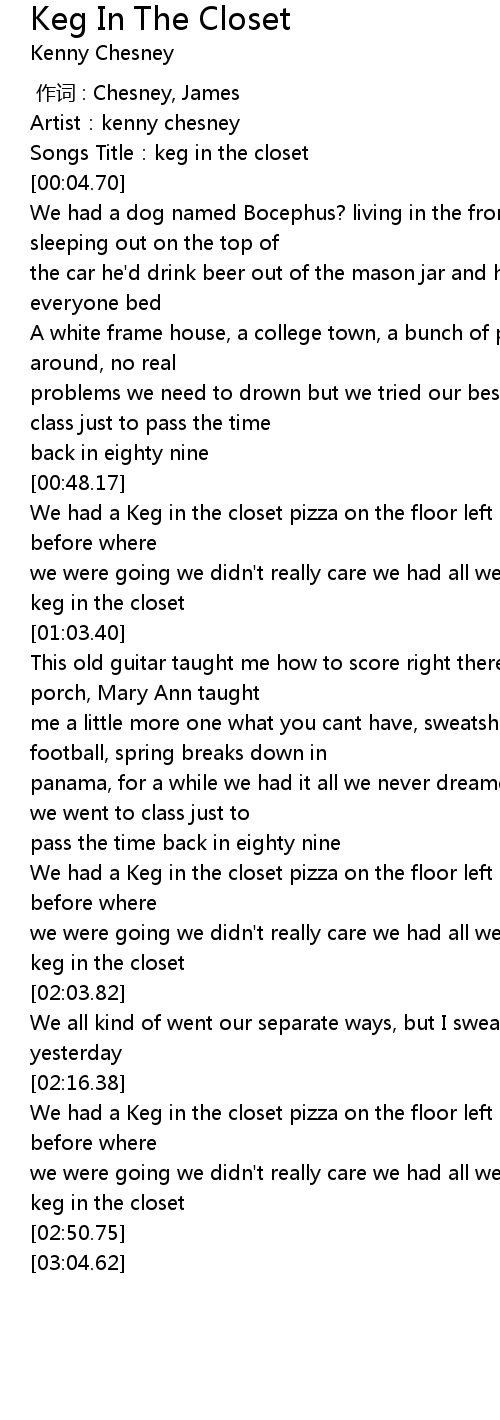 | [00:02.43] | Songs Title: keg in the closet |