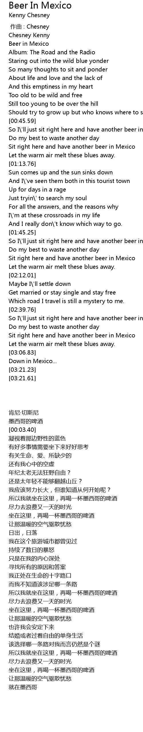 | [01:03.17] | Sit right here and have another beer in Mexico |