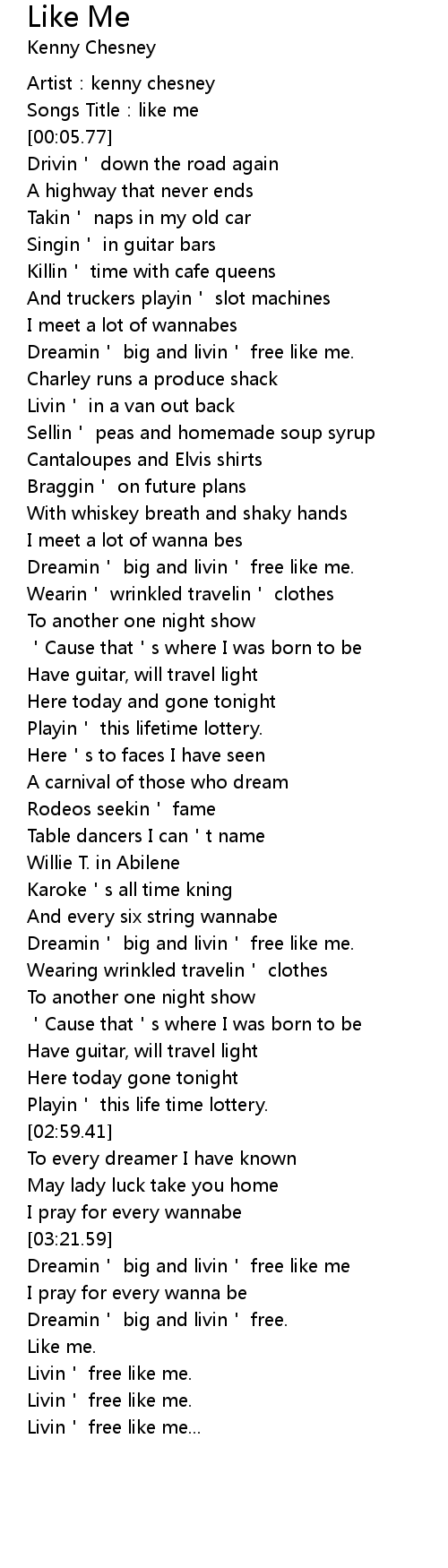 | [03:24.56] | Dreamin' big and livin' free like me |