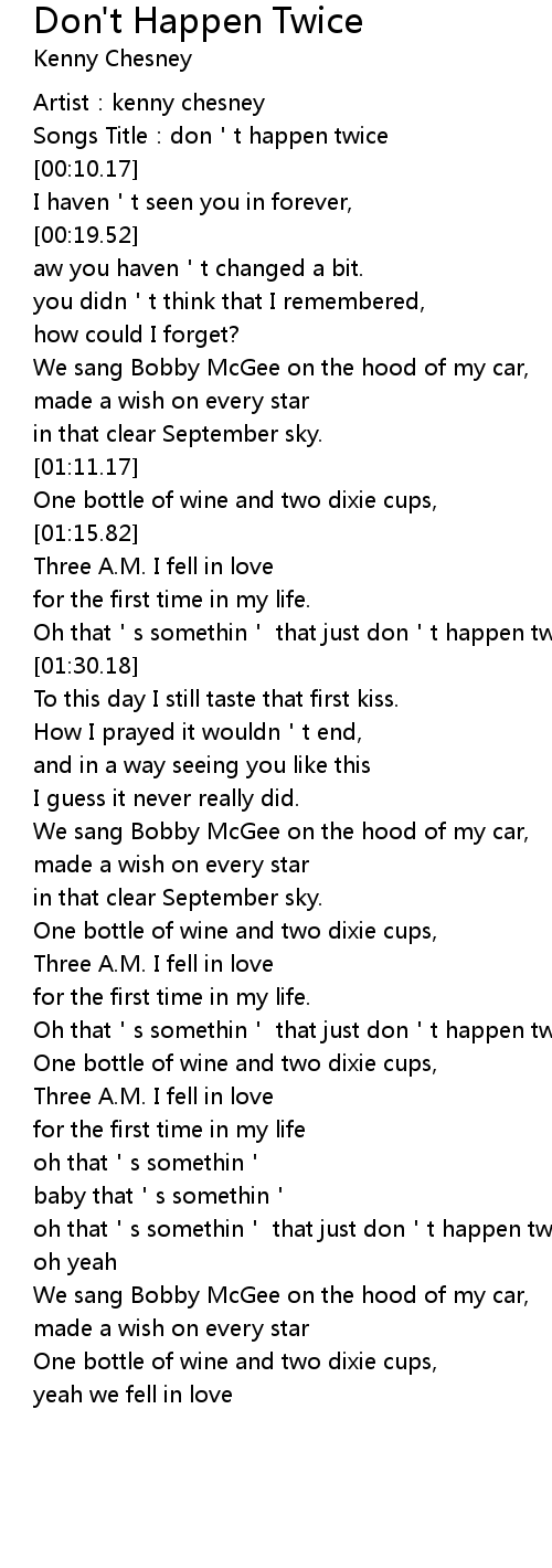 | [02:23.27] | Oh that's somethin' that just don't happen twice. |