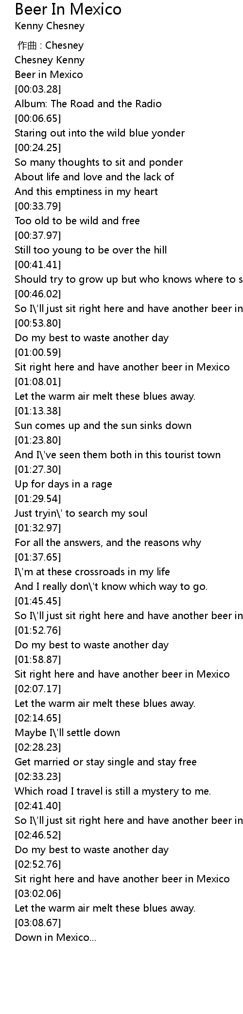 | [01:03.33] | Sit right here and have another beer in Mexico |