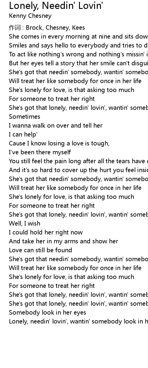 | Lonely, needin' lovin', wantin' somebody look in her eyes |