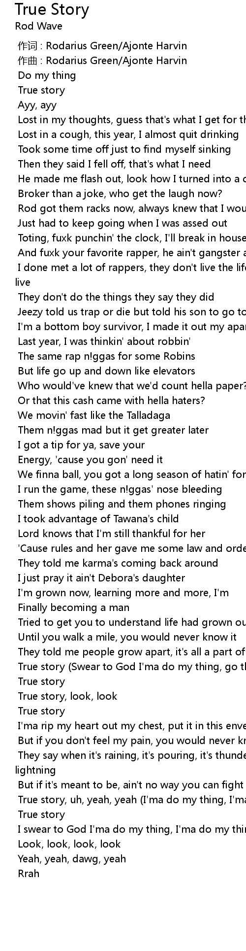 | [01:54.729] | True story (Swear to God I'ma do my thing, go through your pain) |