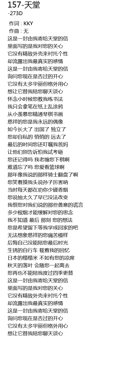 | [01:51.860] | zhè shì yī fēng yóu wǒ jì gěi tiān táng de xìn |