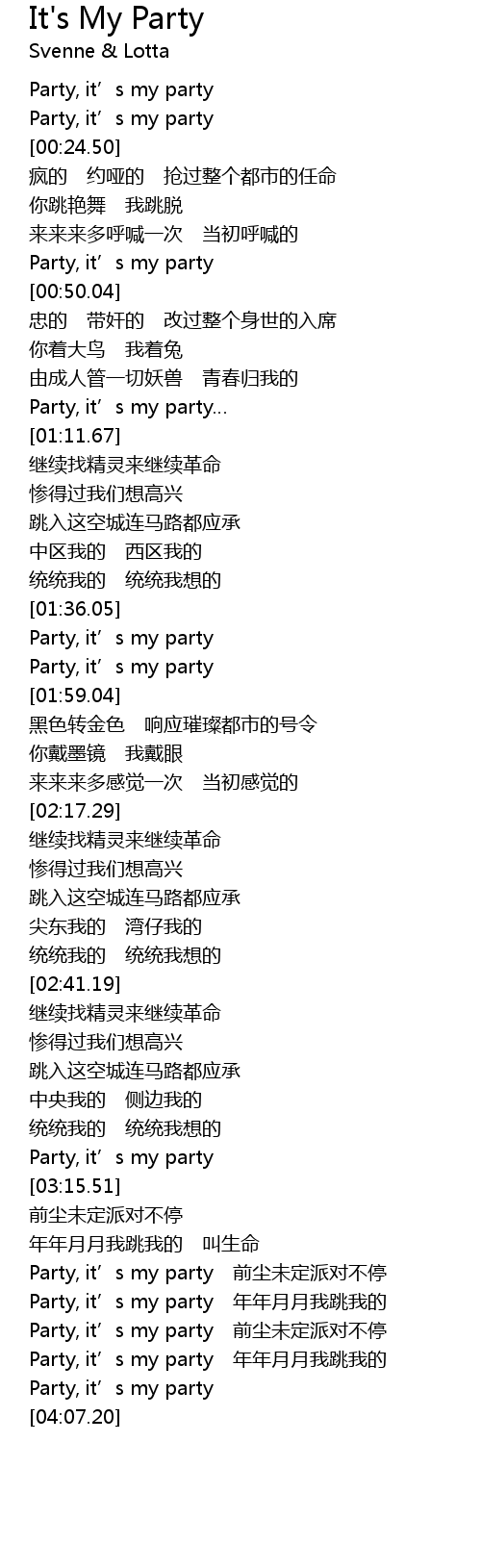 | [03:47.98] | Party, it' s my party qian chen wei ding pai dui bu ting |