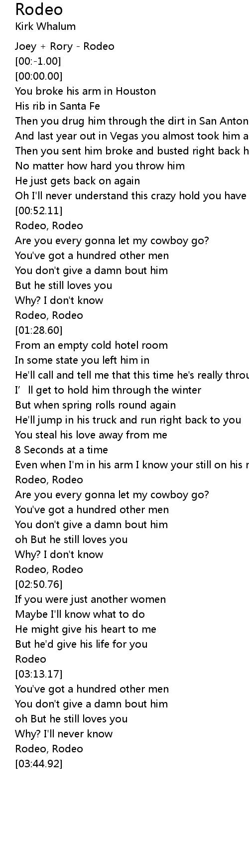 | [00:59.98] | Are you every gonna let my cowboy go? |