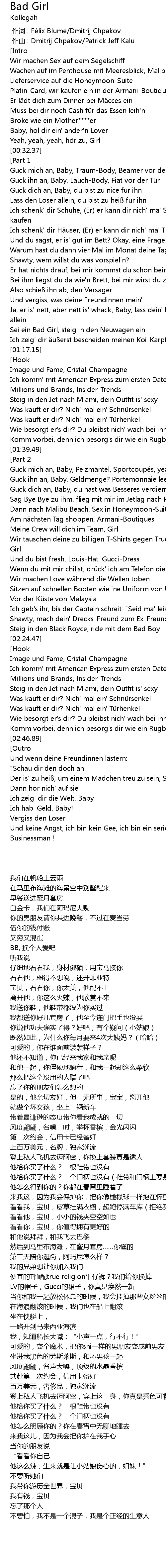 | [02:03.04] | Und du bist fresh, LouisHat, GucciDress |