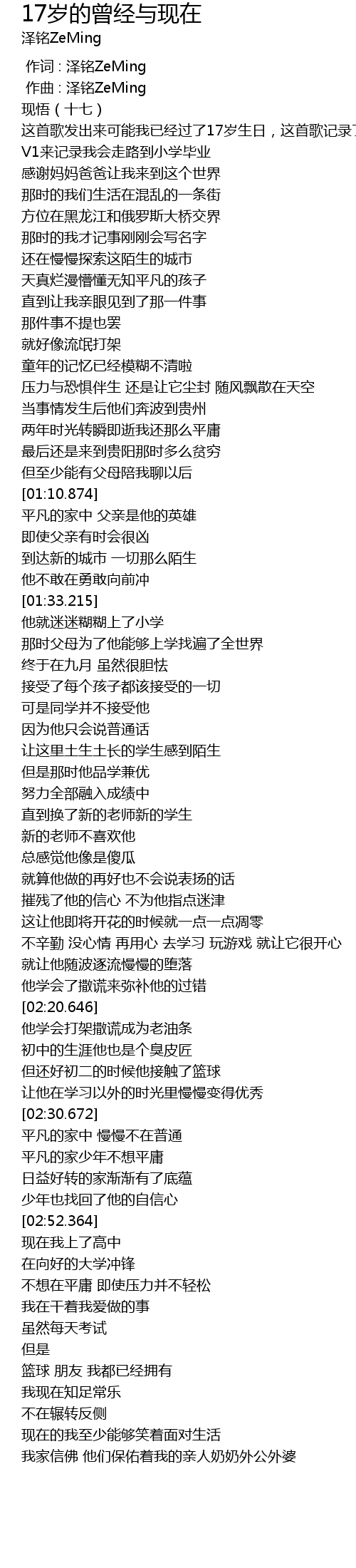 | [00:25.157] | 这首歌发出来可能我已经过了17岁生日,这首歌记录了我从出生开始,到现在对生活的感悟。这也许对很多人来说是一种幼稚,但我想说这首歌不写给任何人,只属于我。 |