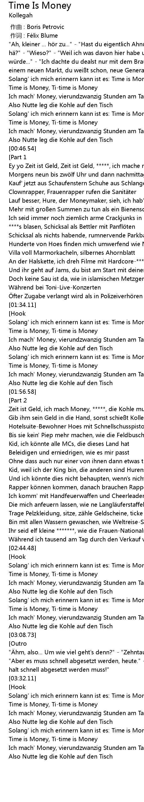 | [01:57.34] | Zeit ist Geld, ich mach Money, *****, die Kohle muss her |