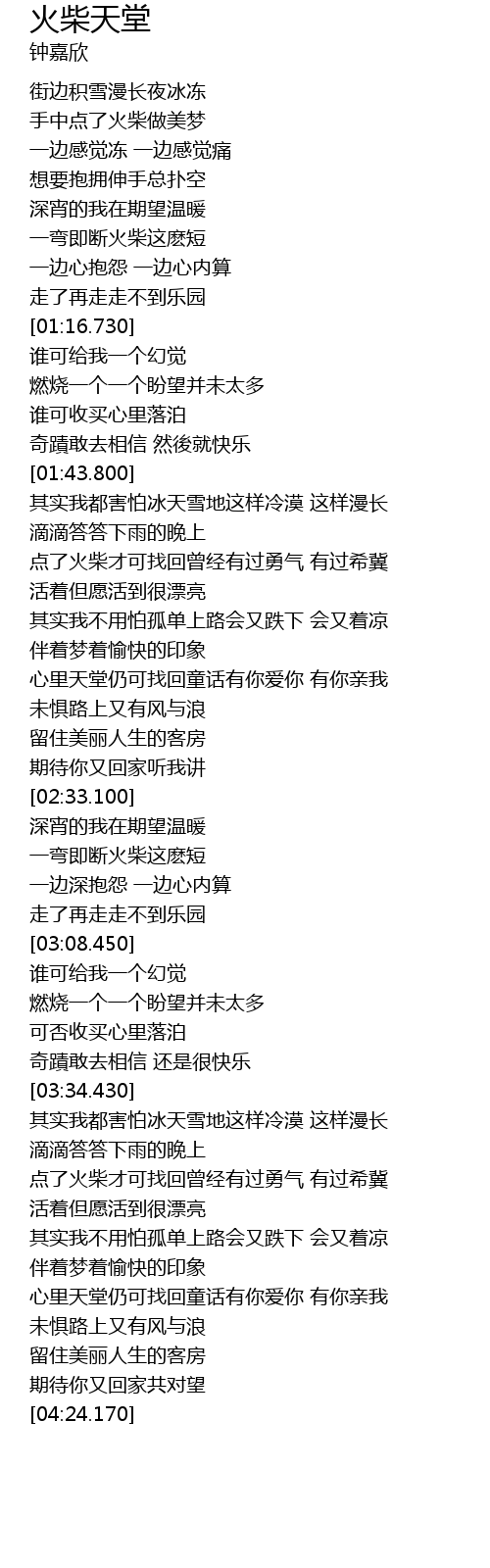 | [01:56.360] | 点了火柴才可找回曾经有过勇气 有过希冀 |