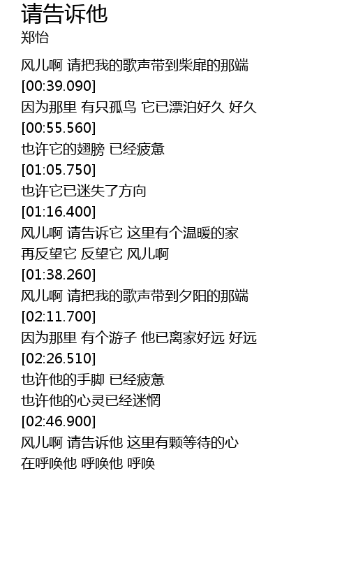 | [00:27.790] | fēng ér a qǐng bǎ wǒ de gē shēng dài dào chái fēi de nà duān |