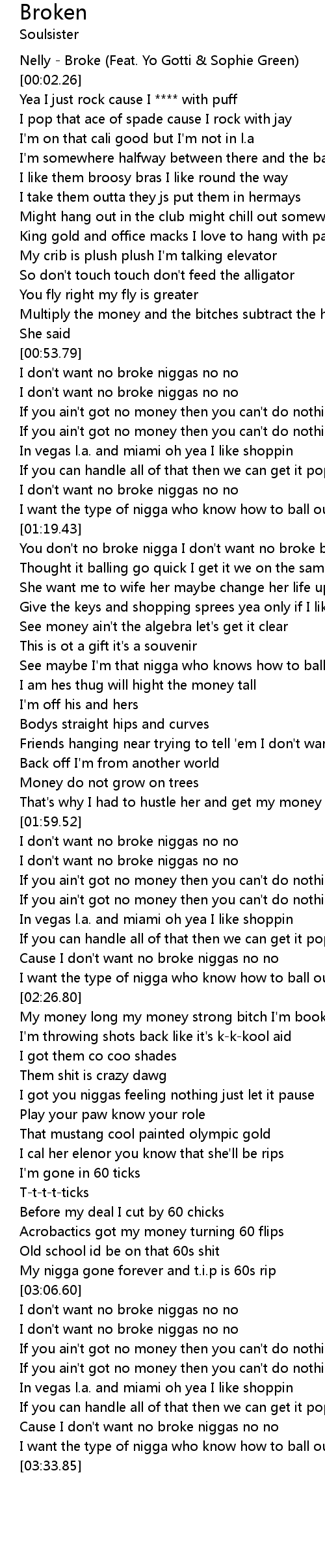 [00:00.20] Nelly - Broke (Feat. Yo Gotti & Sophie Green)