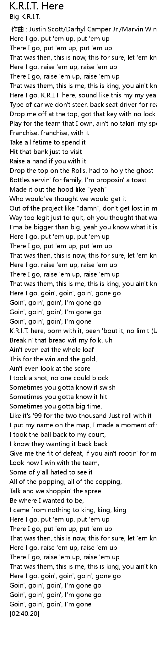 | [00:25.99] | Here I go, K. R. I. T. here, sound like this my my year |