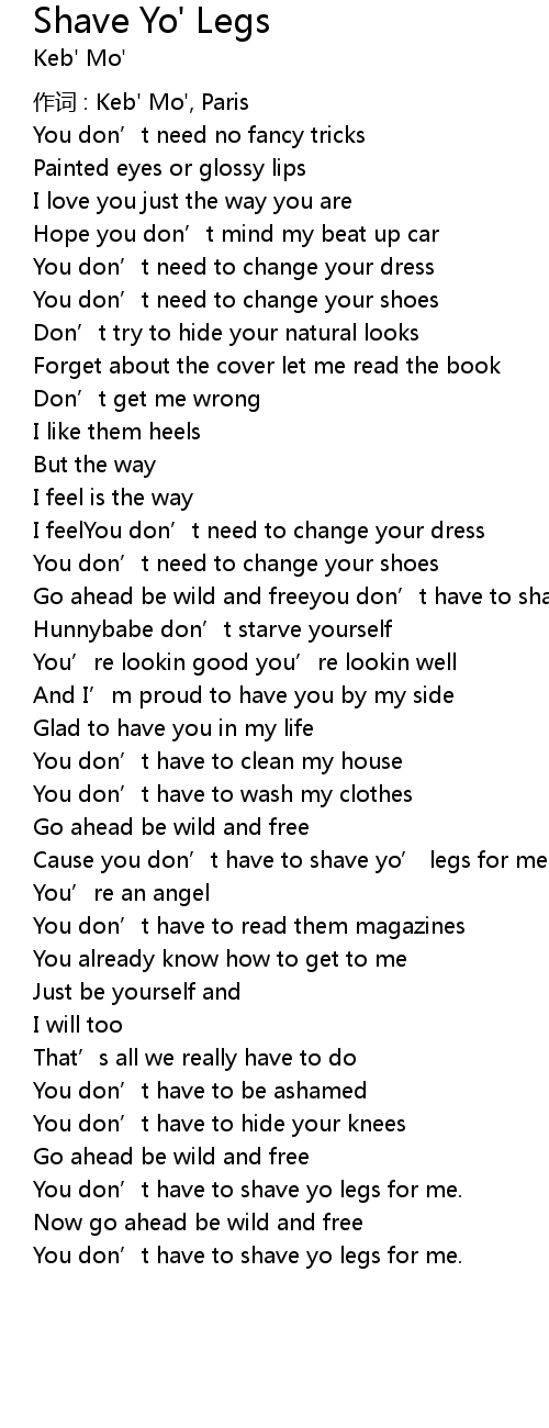 | Go ahead be wild and freeyou don' t have to shave yo' legs for me. | |