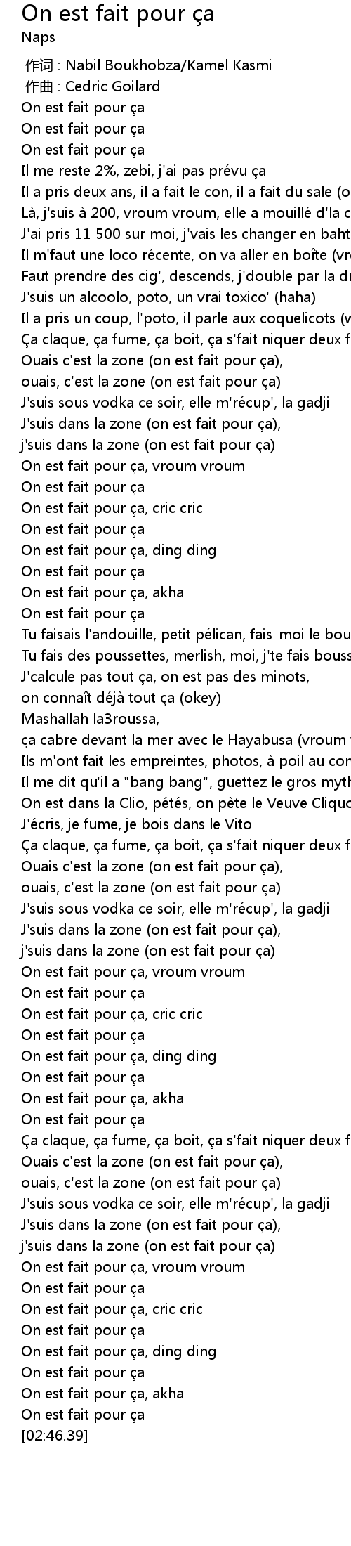 | [02:29.63] | j' suis dans la zone on est fait pour a |
