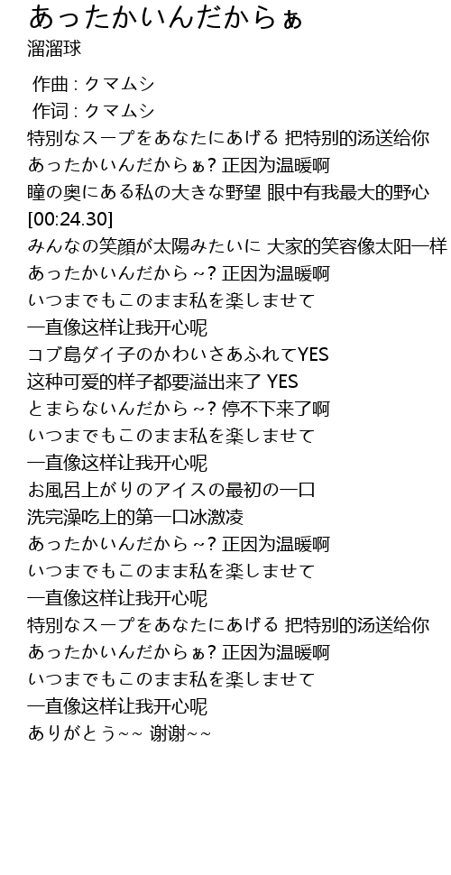 | [01:30.98] | あったかいんだからぁ? 正因为温暖啊 |