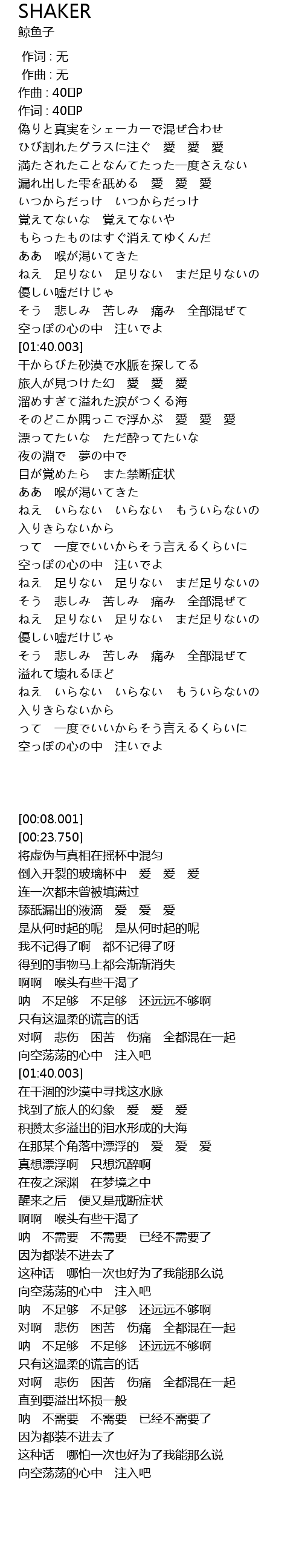| [00:39.008] | ひび割れたグラスに注ぐ 愛 愛 愛 |