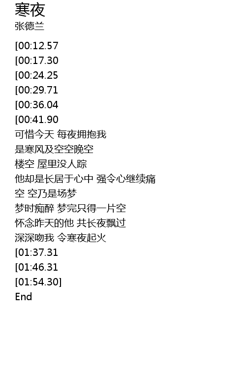 | [01:18.80] | 梦时痴醉 梦完只得一片空 |