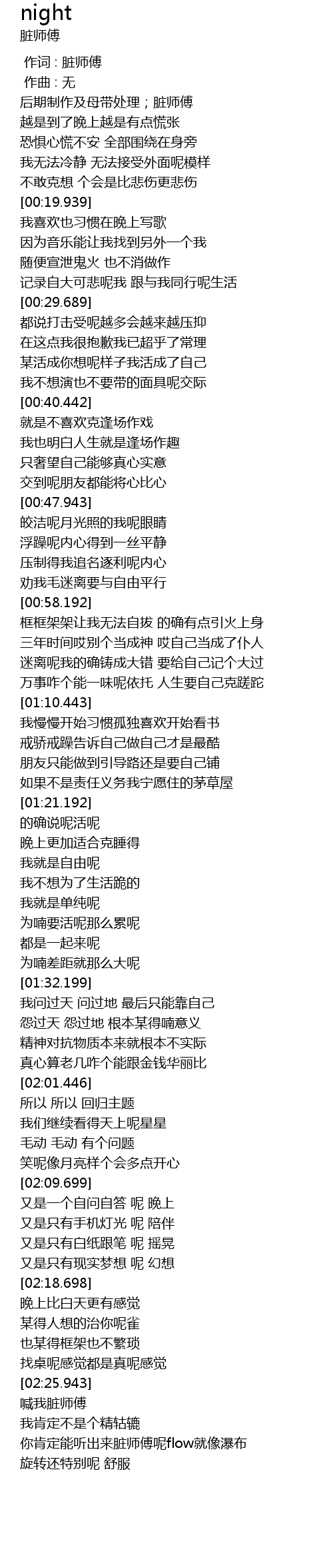 | [02:29.192] | 你肯定能听出来脏师傅呢flow就像瀑布 |