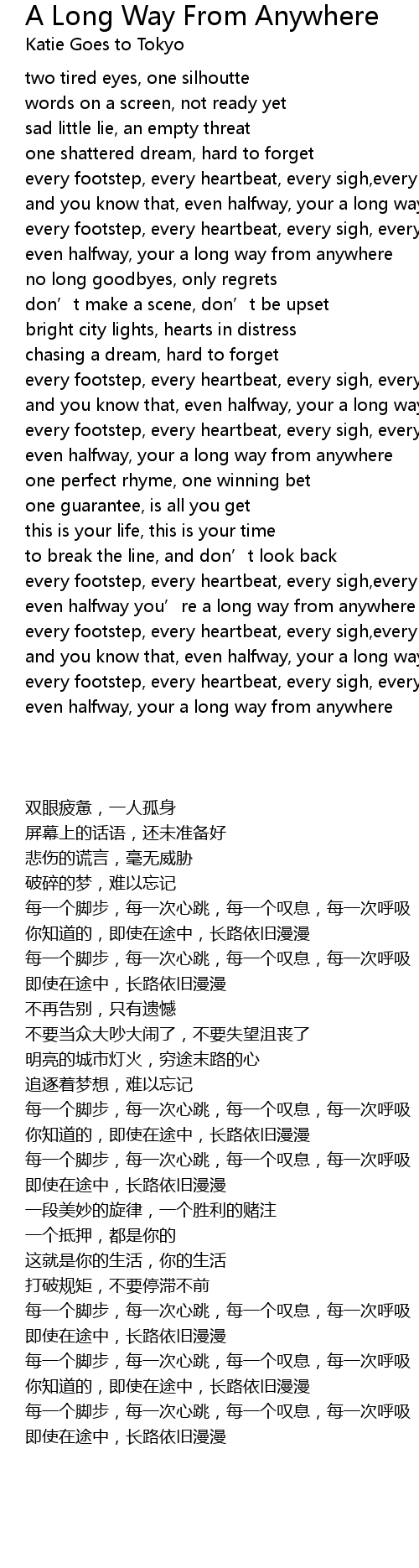 | [00:58.78] | even halfway, your a long way from anywhere |