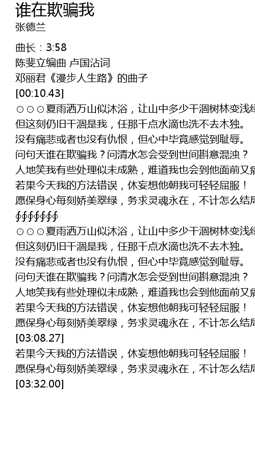 | [00:08.58] | 邓丽君《漫步人生路》的曲子 |